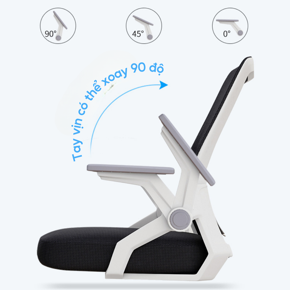 • Tay ghế: Nhựa gập, có thể điều chỉnh lên xuống theo ý muốn, giúp người dùng dễ dàng tìm được tư thế ngồi thoải mái.