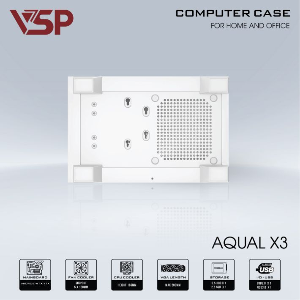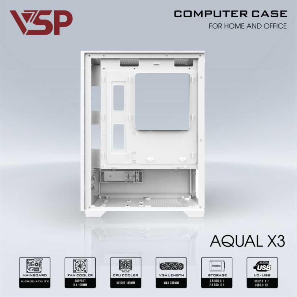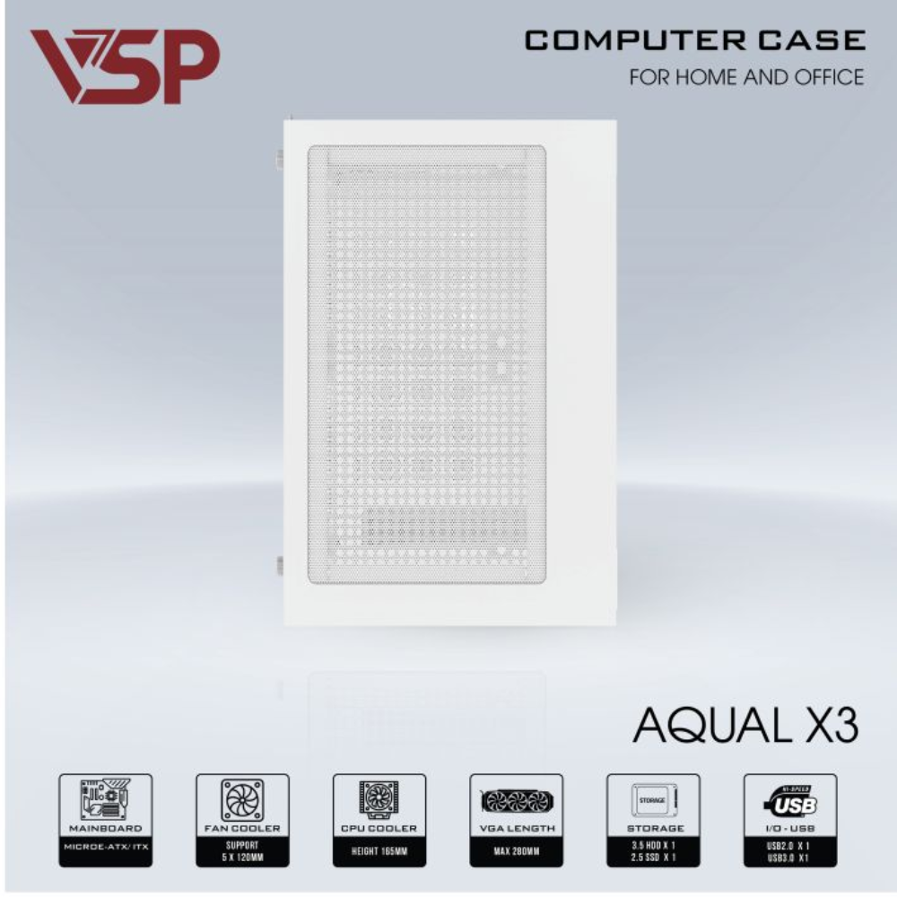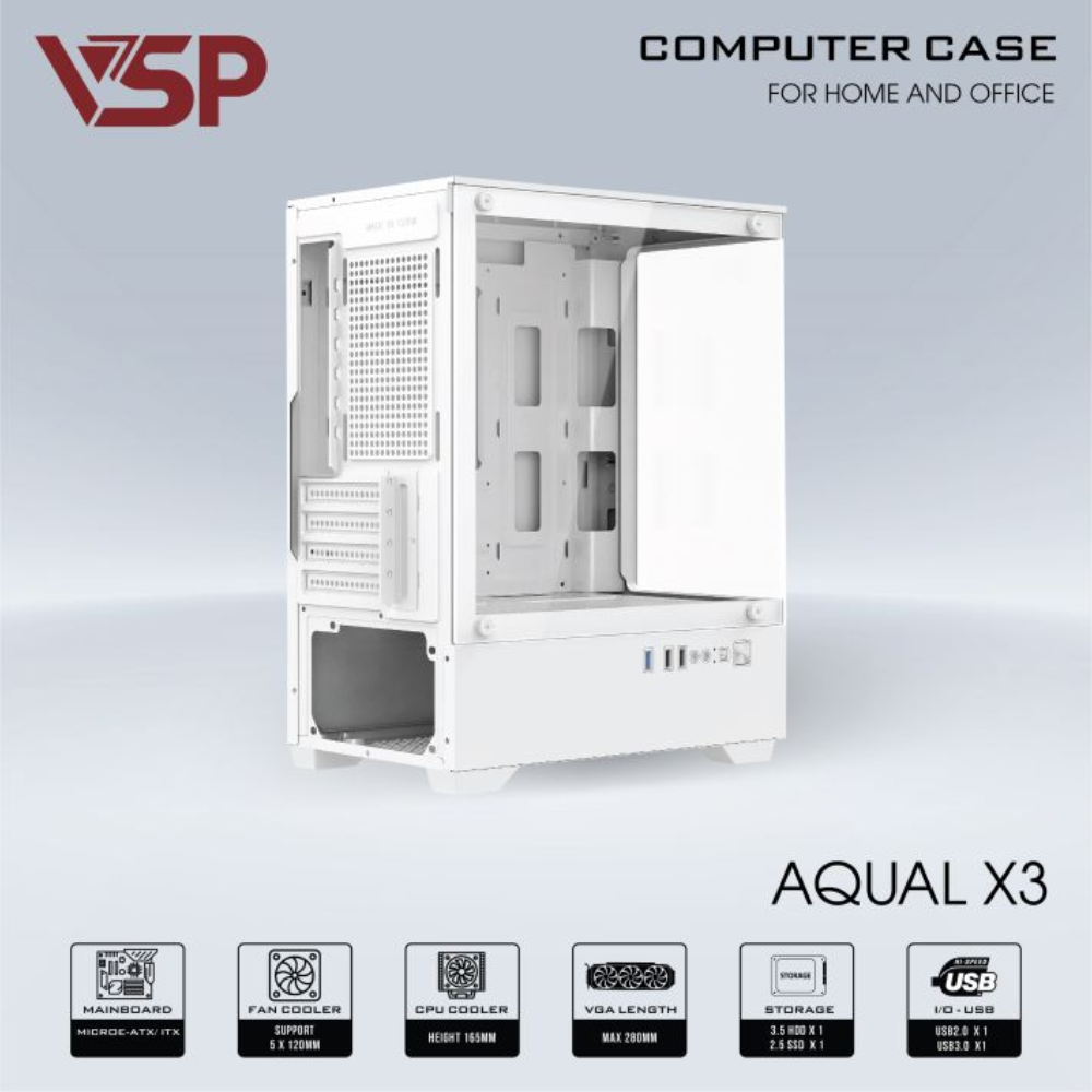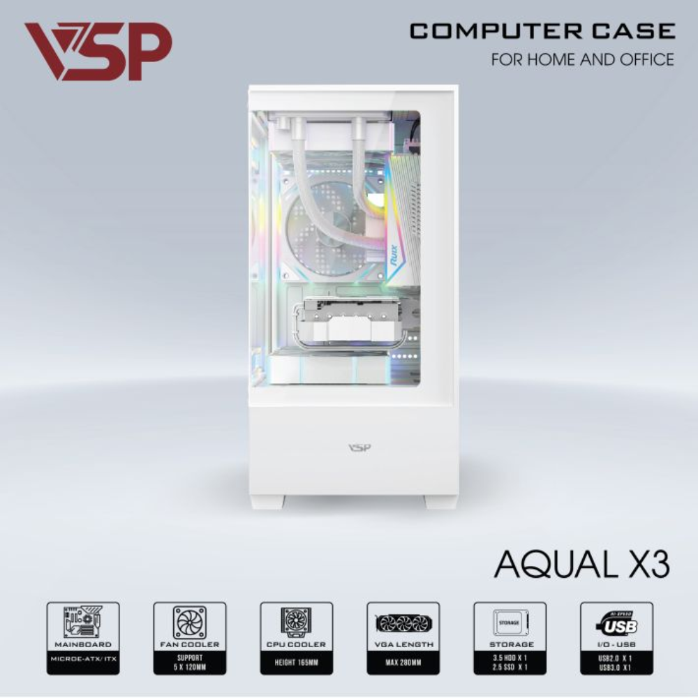 VSP AQUAL X3 gây ấn tượng mạnh nhờ thiết kế tối giản nhưng tinh tế. Với mặt trước sử dụng kính cường lực, bạn có thể dễ dàng khoe trọn hệ thống linh kiện bên trong cùng hiệu ứng LED lung linh. Kích thước chuẩn M-ATX giúp case tương thích với nhiều loại bo mạch chủ và phù hợp với không gian làm việc hoặc giải trí của bất kỳ game thủ nào.