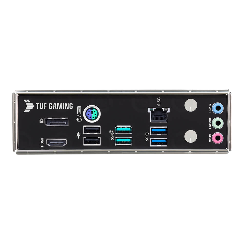 Bo mạch chủ TUF GAMING có bảng điều khiển I/O mặt sau bằng thép không gỉ chống ăn mòn được liên kết với oxi crm để mang lại tuổi thọ lâu hơn ba lần so với hệ thống điều khiển bảng.